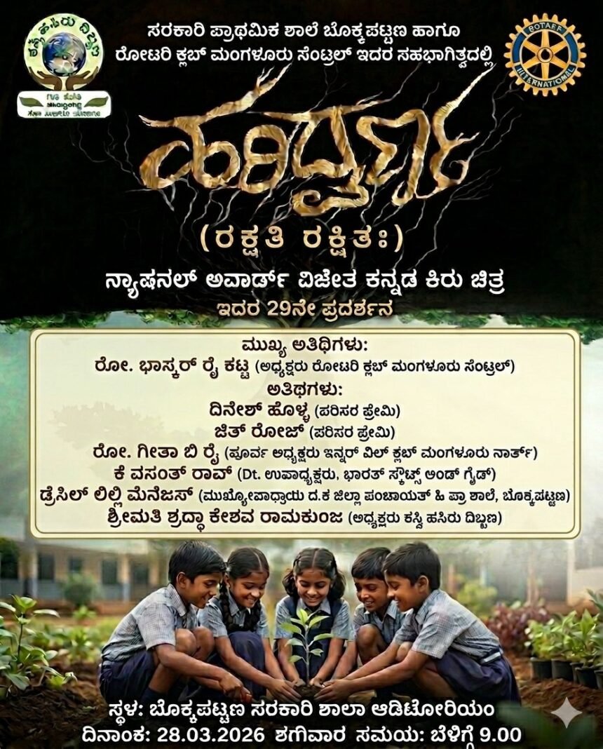 ಮಂಗಳೂರು : ರೋಟರಿ ಕ್ಲಬ್ ಮಂಗಳೂರು ಸೆಂಟ್ರಲ್ ಹಾಗೂ ಸರಕಾರಿ ಪ್ರಾಥಮಿಕ ಶಾಲೆ ಬೊಕ್ಕಪಟ್ಟನ ಇದರ ಸಹಭಾಗಿತ್ವದಲ್ಲಿ ನ್ಯಾಷನಲ್ ಅವಾರ್ಡ್ ವಿಜೇತ ಕನ್ನಡ ಕಿರುಚಿತ್ರ ಹರಿದ್ವರ್ಣ (ರಕ್ಷತಿ ರಕ್ಷಿತಃ) ಇದರ 29ನೇ ಪ್ರದರ್ಶನ 28.03.2026ನೇ ಬೆಳಿಗ್ಗೆ ಬೊಕ್ಕಪಟ್ಟನ ಸರಕಾರಿ ಶಾಲೆಯಲ್ಲಿ ನಡೆಯಿತು