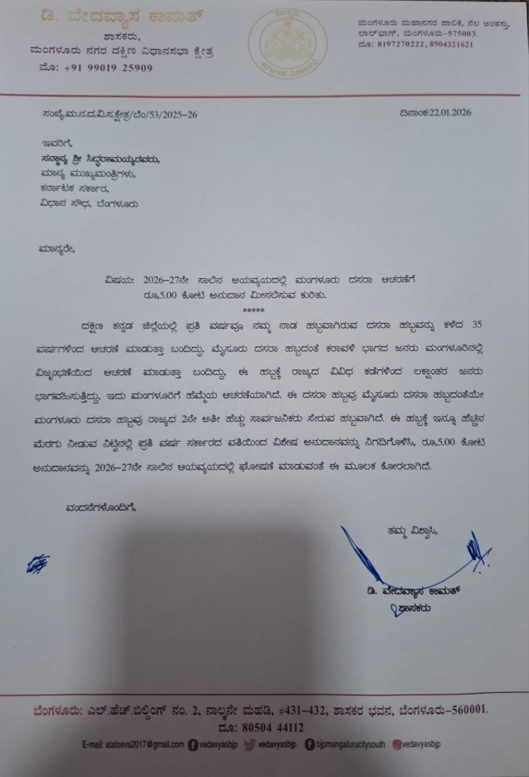 ಮೈಸೂರು ನಂತರ ರಾಜ್ಯದಲ್ಲೇ ಅತೀ ಹೆಚ್ಚು ಜನ ಸೇರುವ ಹಬ್ಬ ಮಂಗಳೂರು ದಸರಾ. ನವರಾತ್ರಿಯ ಸಂದರ್ಭದಲ್ಲಿ ಇಲ್ಲಿನ ಪ್ರಸಿದ್ಧ ತೀರ್ಥಕ್ಷೇತ್ರಗಳು ನಾಡಿನ ಭಕ್ತರಿಂದ ತುಂಬಿರುತ್ತವೆ. ರಾಜ್ಯ ಸರ್ಕಾರ ಬಜೆಟ್ ನಲ್ಲಿ 5 ಕೋಟಿ ಘೋಷಣೆ ಮಾಡಿದರೆ ಇನ್ನಷ್ಟು ವಿಜೃಂಭಣೆಯಿಂದ ದಸರಾ ಆಯೋಜನೆ ಮಾಡಬಹುದಾಗಿದ್ದು ಹಬ್ಬದ ಸಂಭ್ರಮವೂ ಹೆಚ್ಚಲಿದೆ. ದಯವಿಟ್ಟು ಈ ಬಗ್ಗೆ ಆದ್ಯತೆಯ ಮೇರೆಗೆ ಕ್ರಮಗೊಳ್ಳಿ ಎಂದು ಶಾಸಕರು ಮುಖ್ಯಮಂತ್ರಿಗಳಲ್ಲಿ ಮನವಿ ಮಾಡಿದರು.