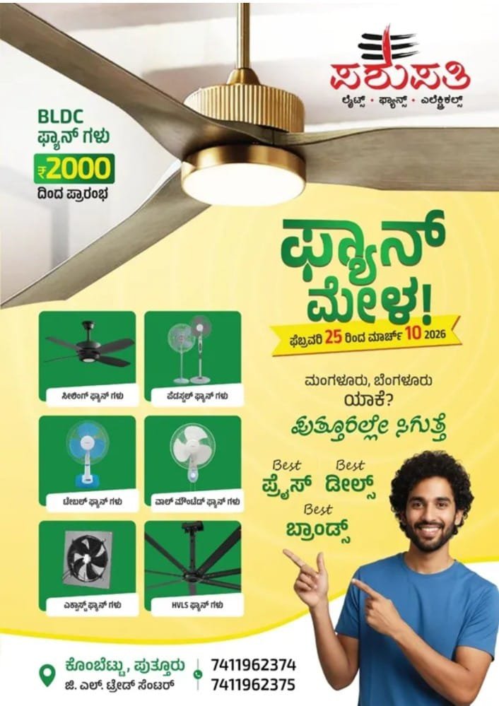 ಪುತ್ತೂರು: ಲೈಟಿಂಗ್ ಕ್ಷೇತ್ರದಲ್ಲಿ ವಿಶೇಷ ಛಾಪು ಮೂಡಿಸಿರುವ ಪುತ್ತೂರಿನ ಕೊಂಬೆಟ್ಟಿನಲ್ಲಿರುವ ಪಶುಪತಿ ಲೈಟ್ಸ್, ಫ್ಯಾನ್ಸ್, ಎಲೆಕ್ಟಿಕಲ್ಸ್’ನಲ್ಲಿ ಇಂದಿನಿಂದ ಫ್ಯಾನ್ ಮೇಳ ಆರಂಭಗೊಳ್ಳಲಿದೆ.